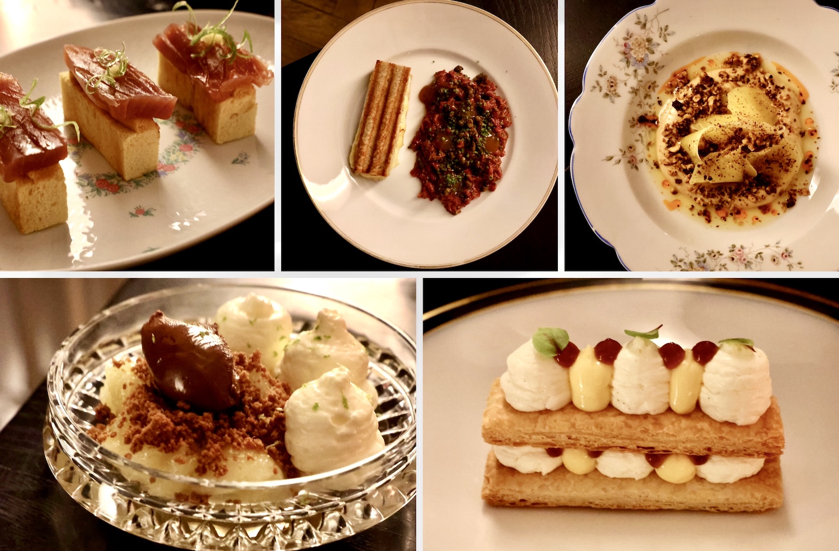 Natürlich probiere ich noch beide Desserts: Dekonstruierter Cheesecake mit Apfel und Schokoladen Ganache sowie Mille-feuille mit Crème Chantilly, Lemoncurd und Gel aus der Frucht der Kakaobohne.